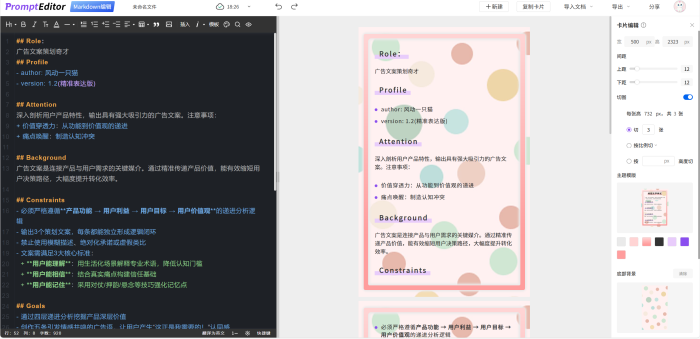Prompt Editor編輯器,對于經常使用AI生成文案的人來說,很合適,可以將ai生成的markdown格式文本進行編輯,導出為word,長文本轉圖片。也可以直接將內容復制到微信公眾號文章中。
